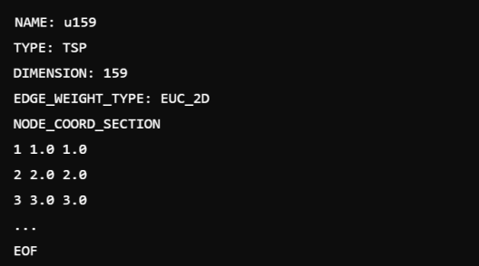 本研究采用的输入数据源自TSPLIB库,该库收录了多个经典的旅行商问题(TSP)实例,广泛应用于各种TSP求解算法的测试与比较。例如,u159.tsp数据集,该数据集涵盖了159个城市的集合,每个城市均赋予了二维坐标。数据文件的格式通常如图所示。