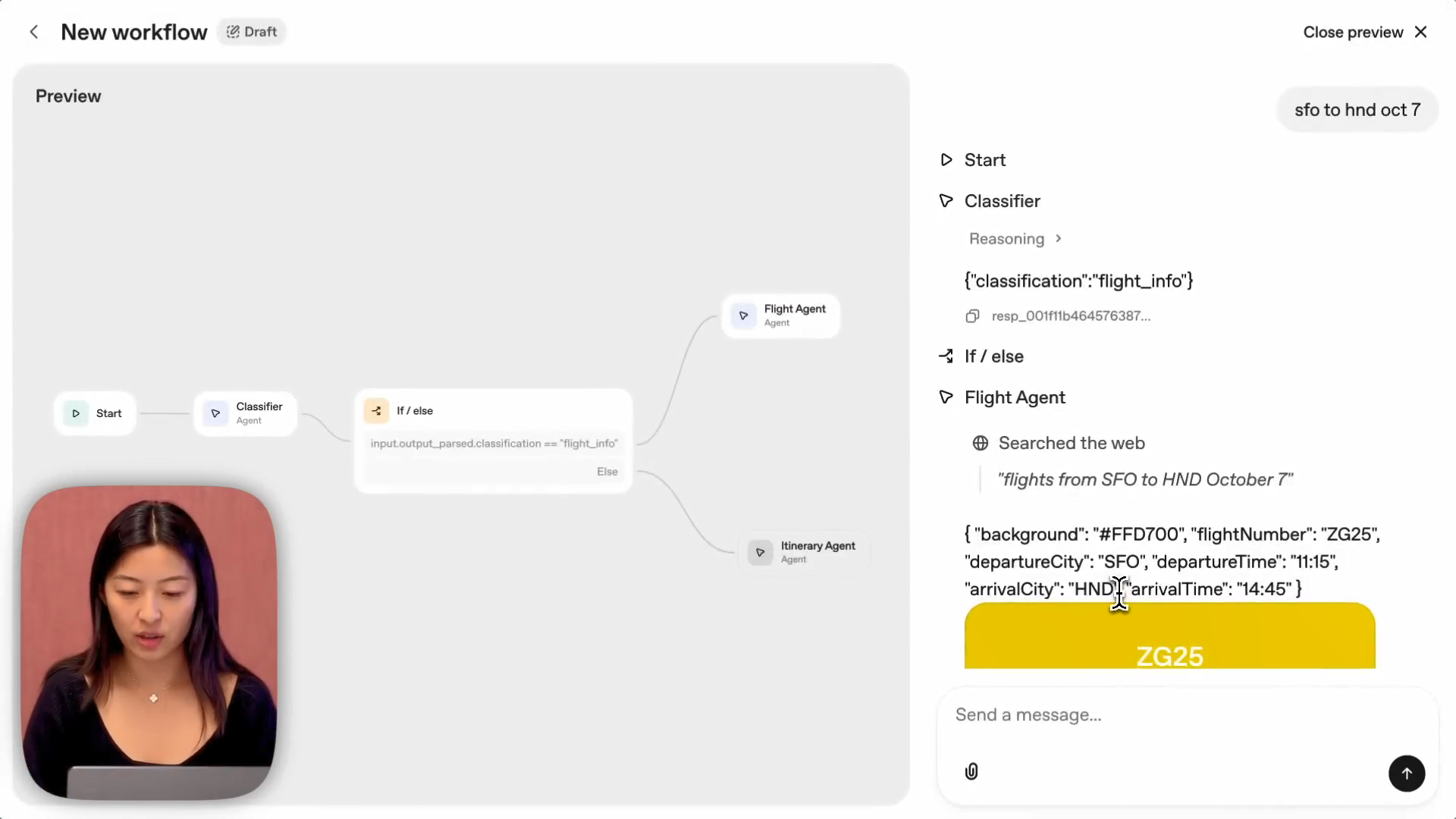 • 路由逻辑:如果 JSON 输出中的 classification 属性值是 flight info,则工作流将分支到专门的航班智能体 (flight agent);否则,它将分支到行程智能体 (itinerary agent)。