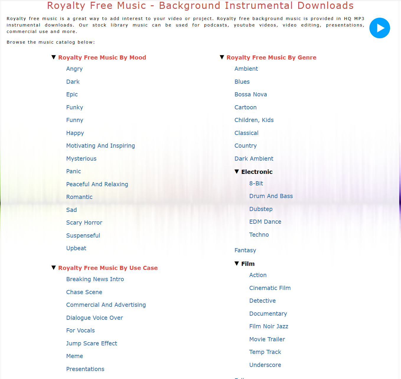 一个专业的音效素材网站,拥有超过 70 万首免版税音效素材(Royalty Free Music),你可以在你的视频或项目中免费下载使用,而不用担心版权问题。网站的音效素材涵盖了各种情绪、主题、影视、游戏等分类,还有一些专为商业项目打造的音乐素材,非常实用。这样一个值得收藏的音效素材网站,可以为你的视频增添色彩和氛围哦。