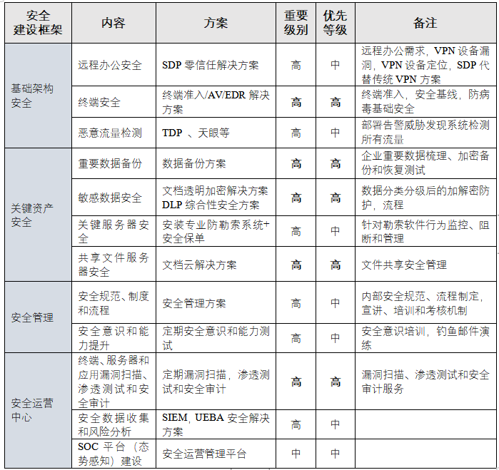 1. 完善基础安全建设。主要包括网络安全(重要网段隔离和访问控制,无线网络安全,远程访问VPN安全等),服务器和终端安全(准入,病毒查杀,补丁管理,基线检查),以及必要的安全管理规范和流程(个人电脑、服务器、数据库、代码库的安全规范,权限申请流程等)