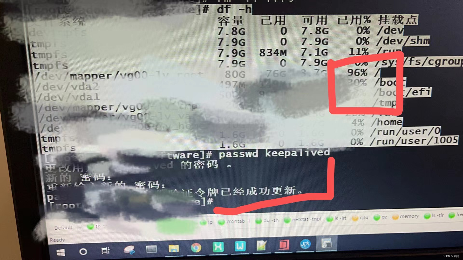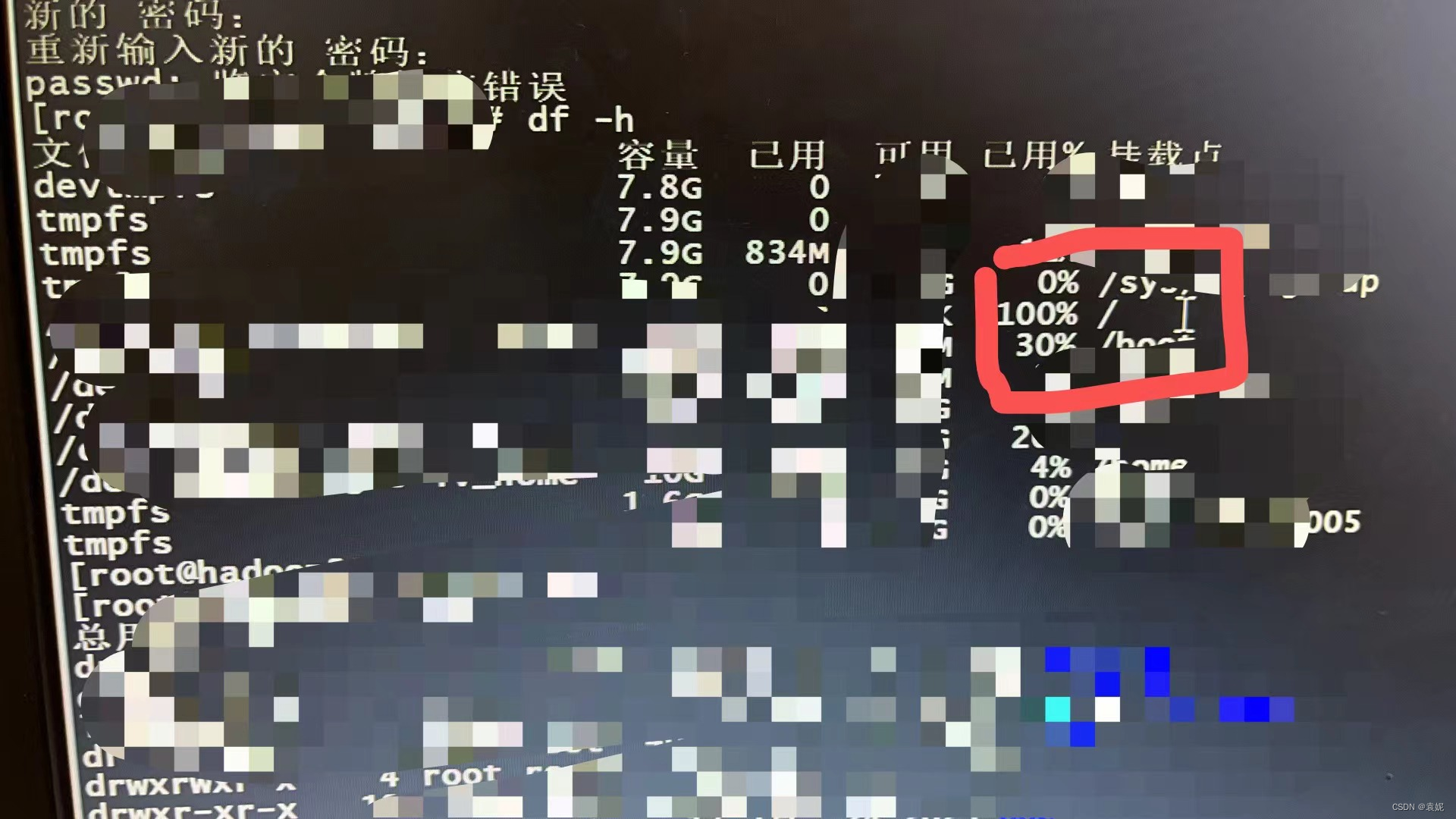 然后想着会不会是磁盘空间不足,就顺手一个df -h ,结果果然是100%,赶紧删了一些过期的文件