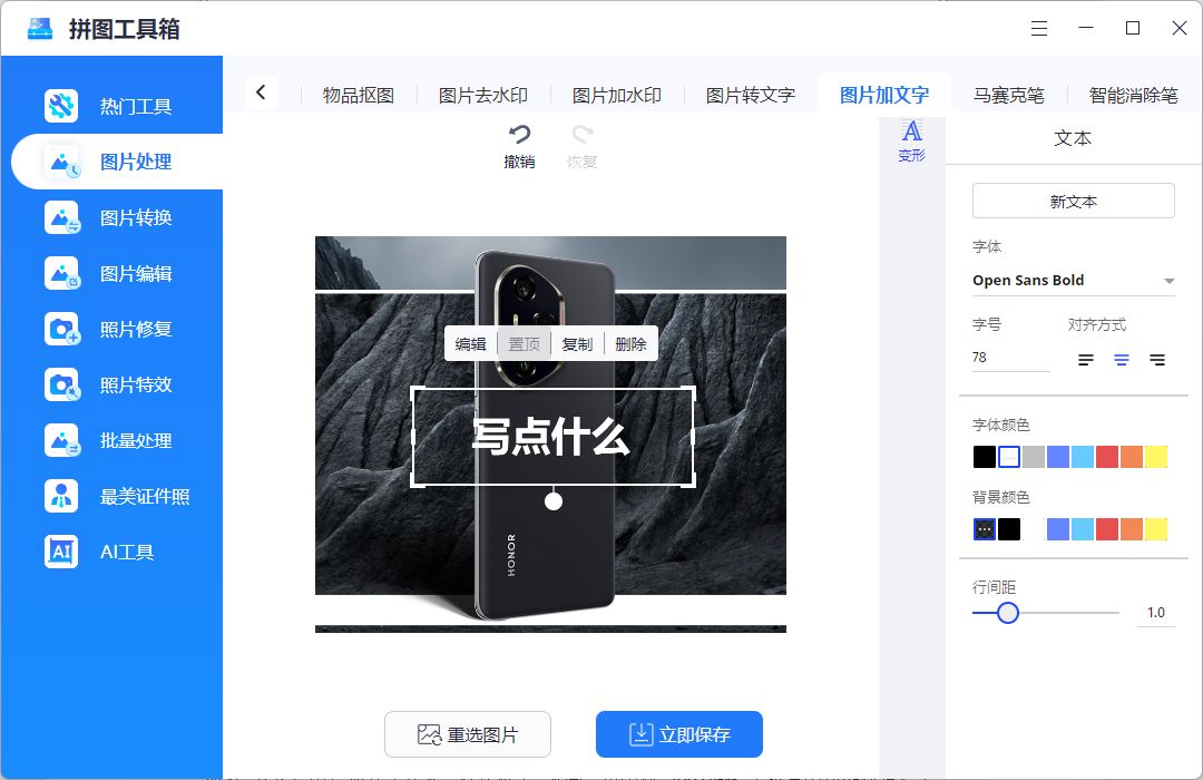 这里给你推荐一款特别好用的电脑端软件 —— 拼图工具箱。别看它名字里带 “拼图”,但 “图片加文字” 功能一点都不含糊,而且操作简单,功能还很强大。用它给图片加文字,首先字体选择更多,软件自带了上百种字体,从商务正式的衬线字体,到个性十足的创意字体,甚至还有一些小众的外文艺术字体,完全能满足不同场景的需求。其次文字编辑功能更专业,除了调整大小、颜色,还能给文字添加阴影、立体效果、边框等特效。