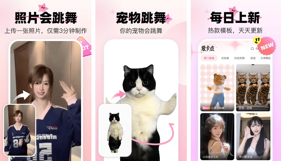 💭爱卡点 APP:虽然名字里带 “卡点”,但这款 APP 在照片跳舞功能上也毫不逊色,尤其擅长将整体舞蹈动作与音乐卡点结合。它不仅有 “眨眼”“微笑” 等细微动作模板,还有大量 “卡点舞蹈” 模板,你可以给制作好的舞蹈动态照片搭配喜欢的音乐,软件会自动调整舞蹈节奏,让人物的抬手、转身、摆动身体等动作和音乐节拍契合,制作出的短视频观赏性十足。而且它的操作步骤特别简单,全程引导式操作,跟着提示点几下就能完成制作,对新手非常友好,很适合想要制作有趣卡点舞蹈视频的用户。