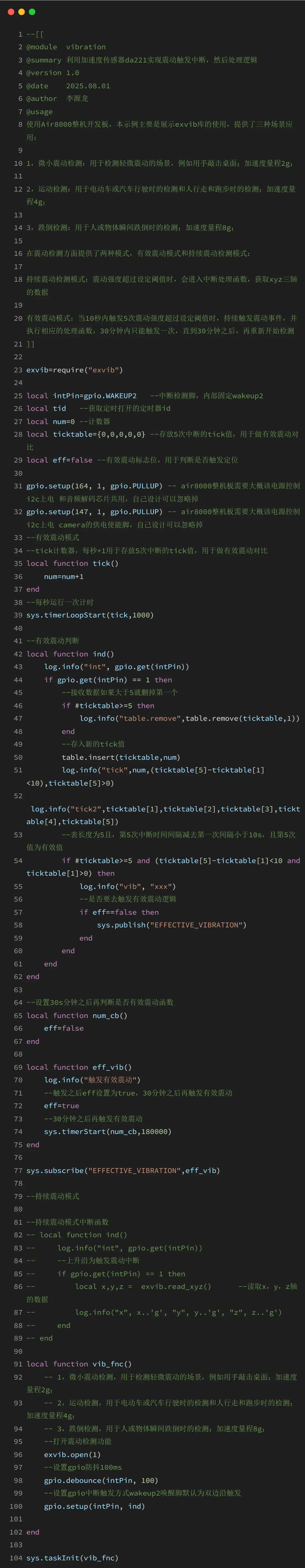 加载了 exvib 库,开启 task 协程,调用 exvib.open(1)接口开启振动监测模式 1:微小震动检测,设置 gpio.WAKEUP2 防抖 100ms,防抖的作用是 100ms 只能触发一次,防止误触,然后设置中断模式触发,关于触发方式我们提供了两种场景的应用:
