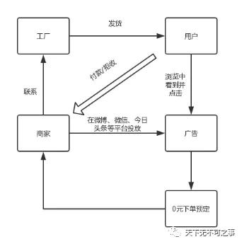 二类电商可以简单理解为商家脱离淘宝、京东这类的电商平台,通过投放广告,以货到付款的形式进行交易的商业模式,大概流程如图: