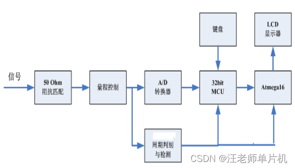 经过12位A/D转换器ADS7819转换后的数字信号经由32位MCU进行FFT变换和处理,分析其频谱特性和各个频率点的功率值,然后将这些值送由Atmega16进行显示。信号由32 位MCU分析后判断其周期性,然后由Atmegal6进行测量,然后进行显示。