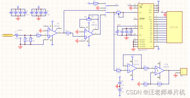 信号输入后通过R5,R6两个100Ohm的电阻和一个高精度仪表运放AD620实现跟随作用,由于理想运放的输入阻抗为无穷大,所以输入阻抗即为:R5//R6=50Ohm,阻抗匹配后的通过继电器控制是对信号直接送给AD转换还是放大20倍后再进行AD转换。