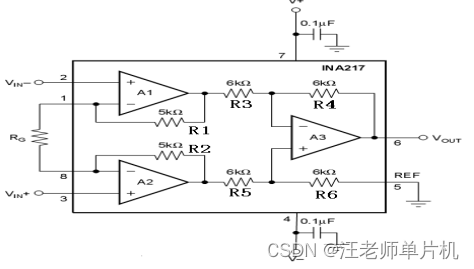 我们选择的运放是TI公司的低噪声、低失真的仪表放大器INA217,其失真度在频率为1KHz,增益为20dB(100倍放大)时仅为0.004%,其内部原理图如图2-2所示。