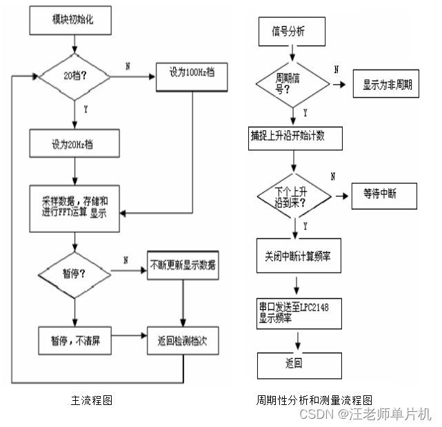 主控制芯片为LPC2148,测量周期为Atmega16实现,由于处理器速度较快,所以采用c语言编程方便简单.软件流程图如下: