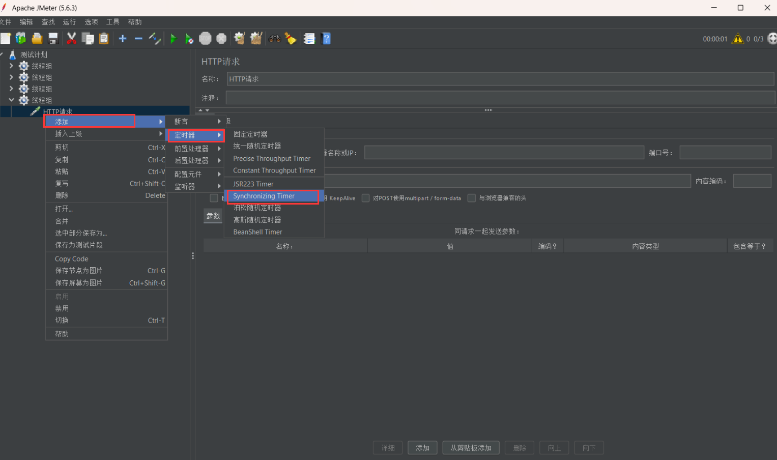 位置:测试计划 --> 线程组--> HTTP请求(右键添加)定时器-->Synchronizing timer