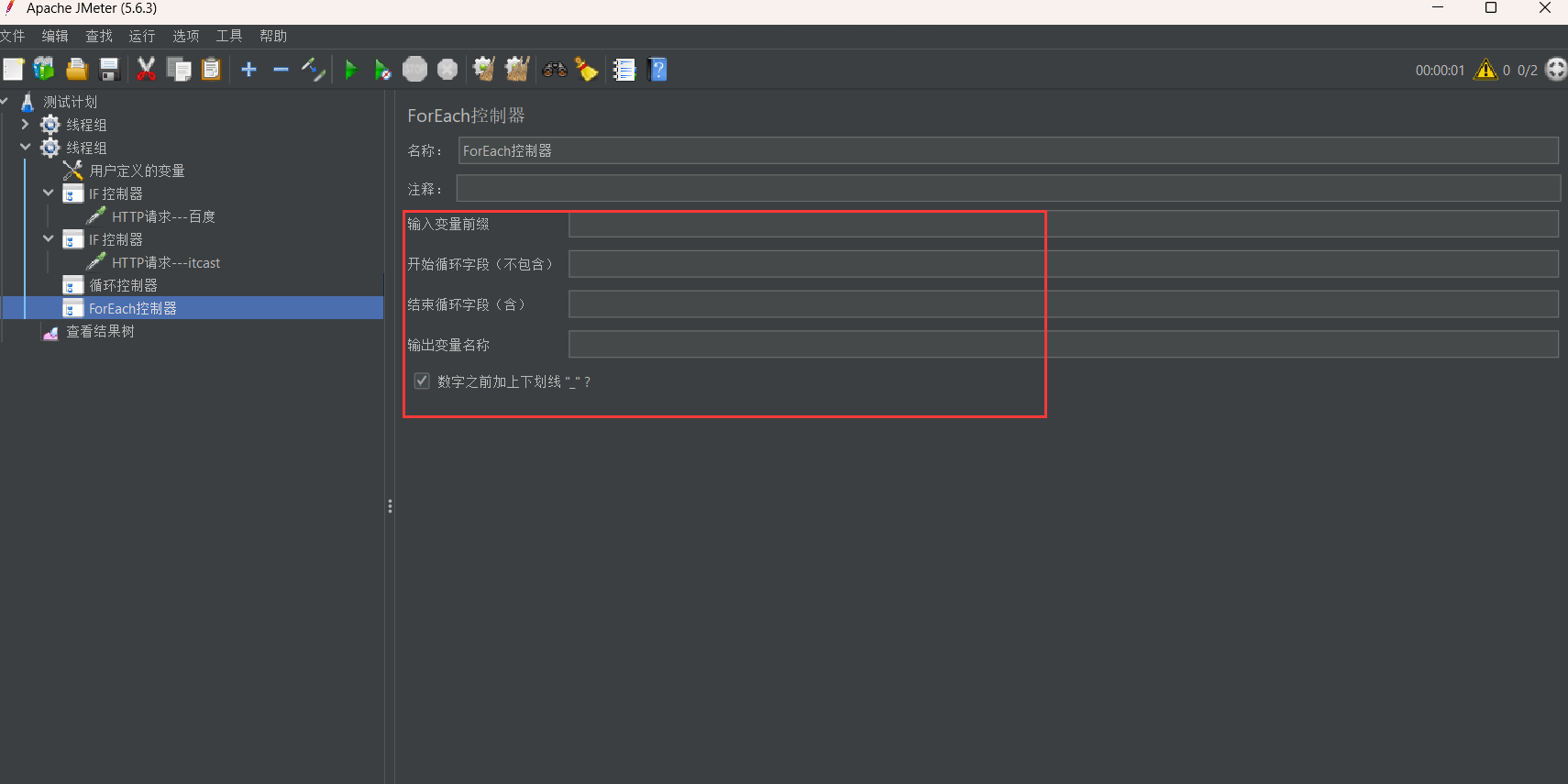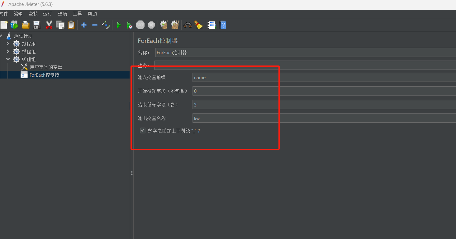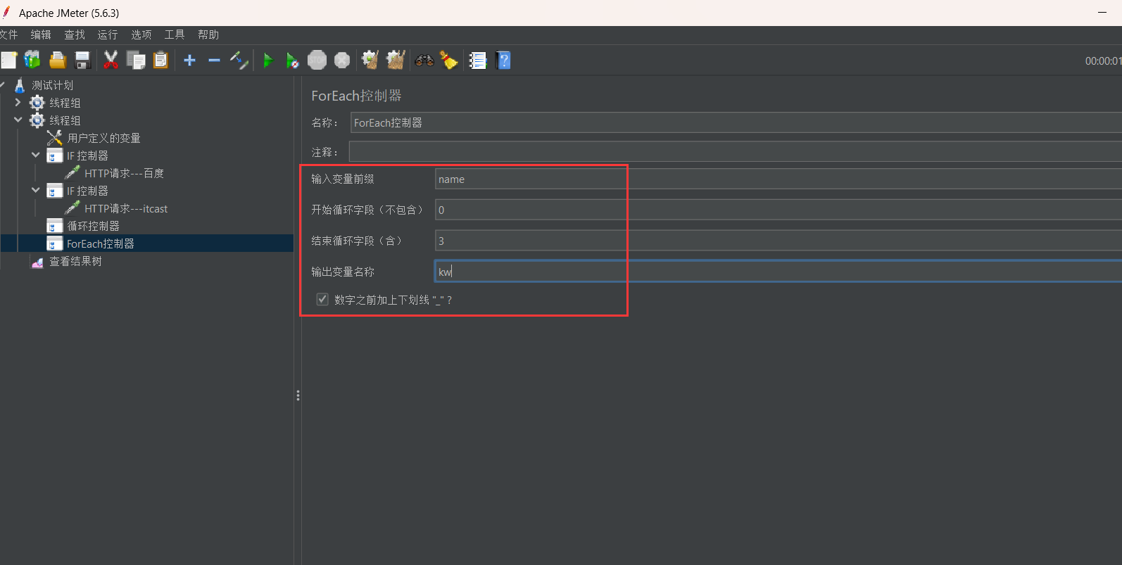 作用:一般和用户自定义变量或者正则表达式提取器一起使用,读取返回结果中一系列相关的变量。该控制器下的取样器都会被执行一次或多次,每次读取不同的变量值。