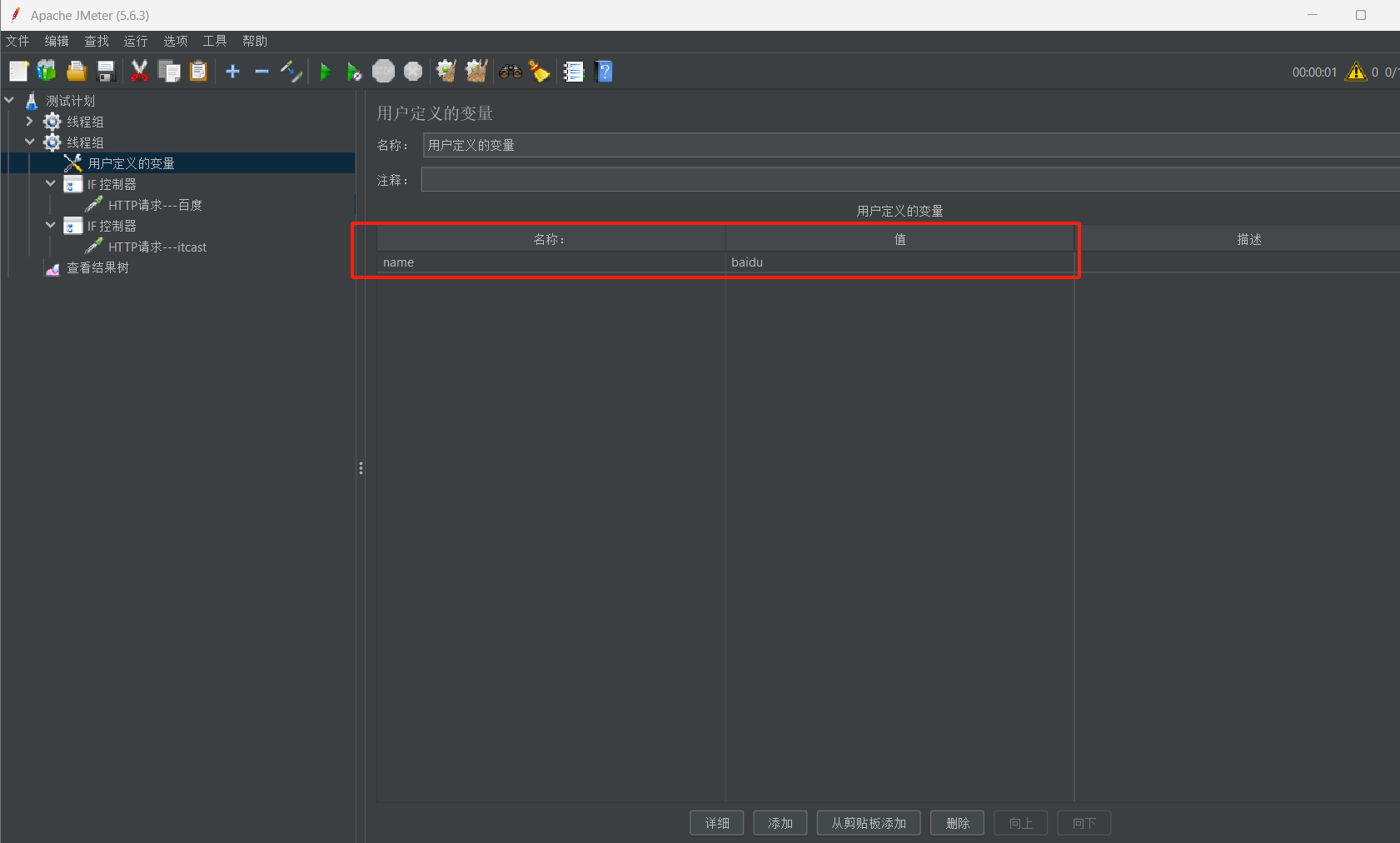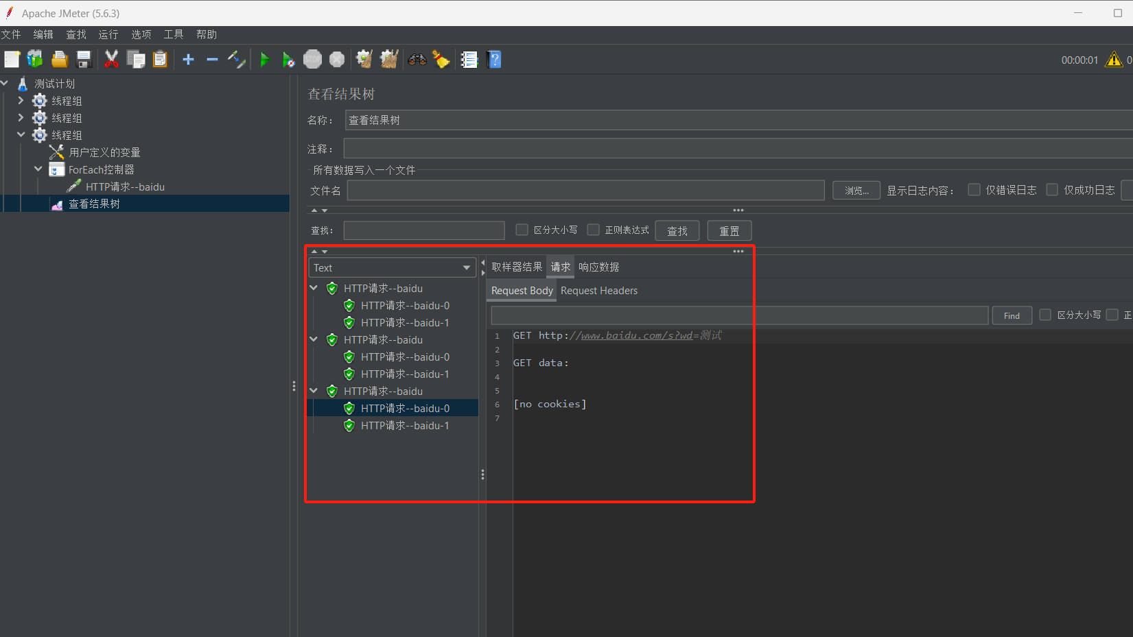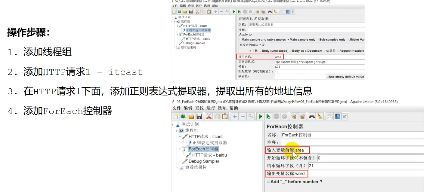 作用:一般和用户自定义变量或者正则表达式提取器一起使用,读取返回结果中一系列相关的变量。该控制器下的取样器都会被执行一次或多次,每次读取不同的变量值。
