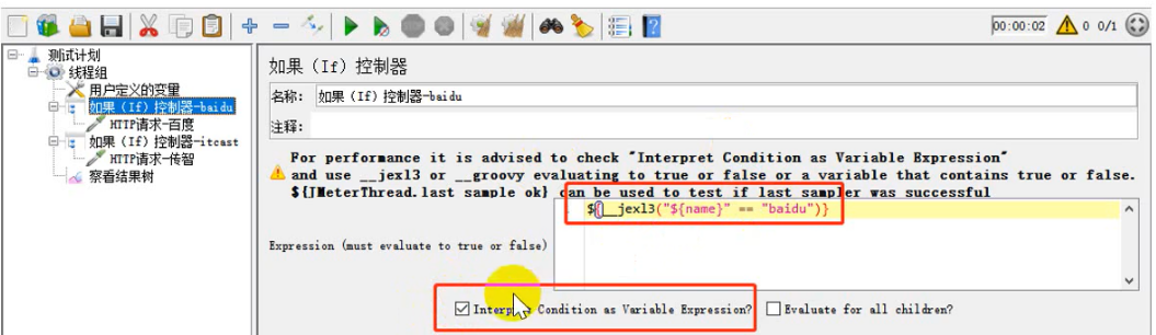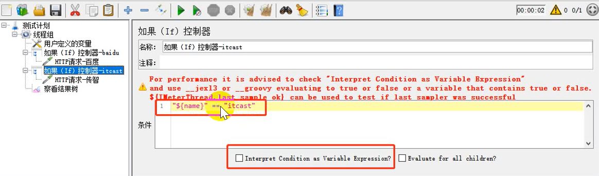 位置:测试计划-->线程组-->(右键添加)逻辑控制器:--> 如果(If)控制器