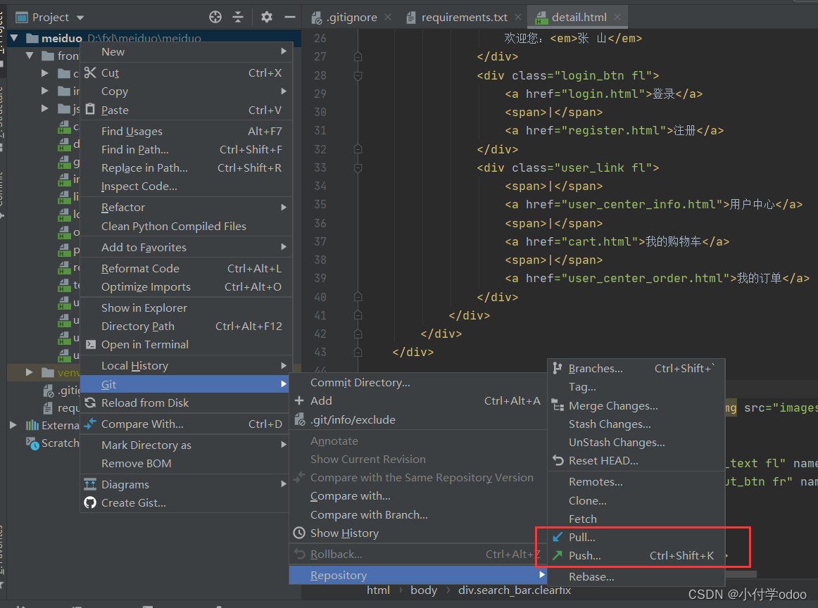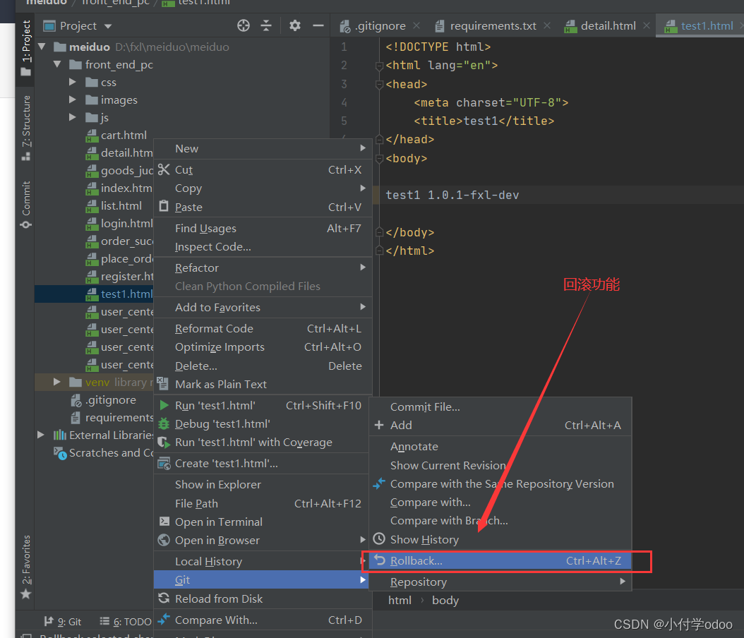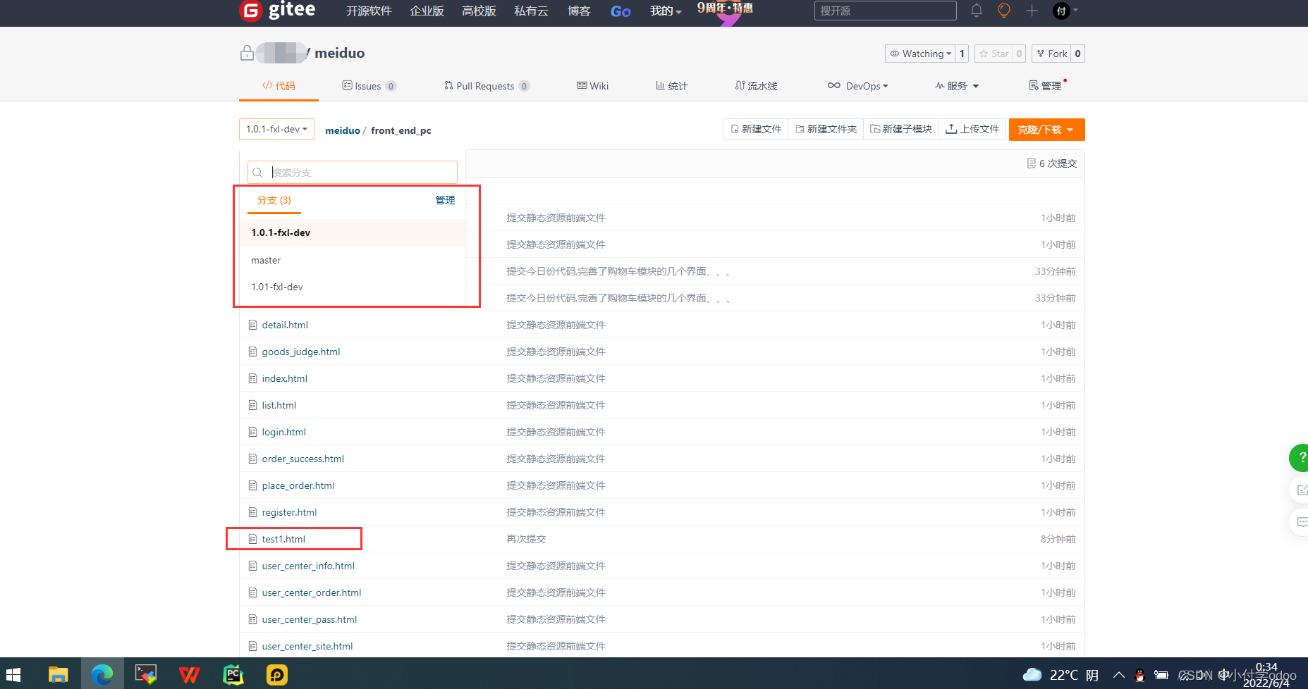 然后再去码源就能看到自己提交上去的新分支了:新写的页面test.html也上传进去了