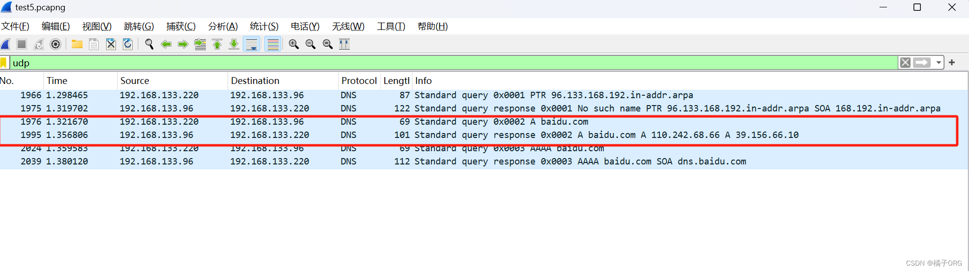 (3)停止捕获,将捕获结果保存为test5,在显示过滤器上输入dns。定位到实验解析的DNS查询报文和查询响应报文,附截图