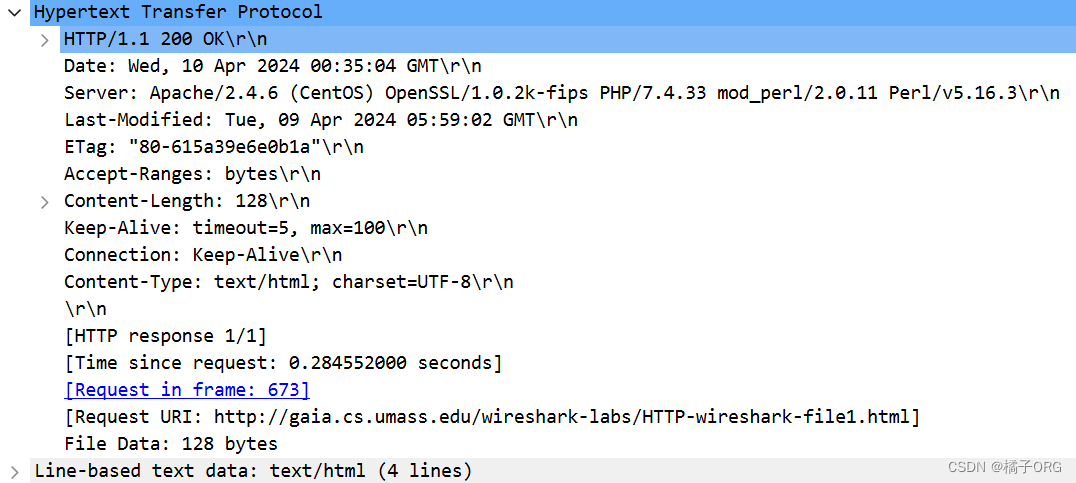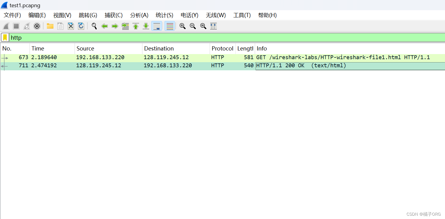 http://gaia.cs.umass.edu/wireshark-labs/HTTP-wireshark-file2.html 您的浏览器应显示一个非常简单的五行HTML文件。将捕获结果保存为test2,再次快速地将相同的URL输入到浏览器中(或者只需在浏览器中点击刷新按钮)。停止Wireshark数据包捕获,并在display-filter-specification窗口中输入“http”,以便只捕获HTTP消息,并在数据包列表窗口中显示。将捕获结果保存为test3.回答下列问题