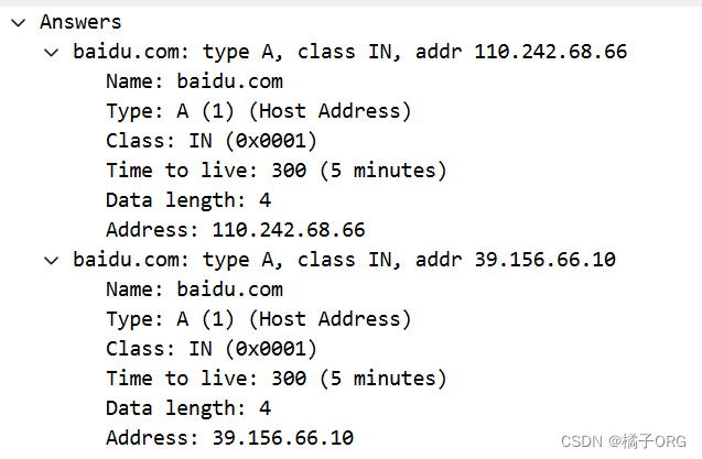 | Answers | baidu.com: type A, class IN, addr 110.242.68.66 baidu.com: type A, class IN, addr 39.156.66.10 |