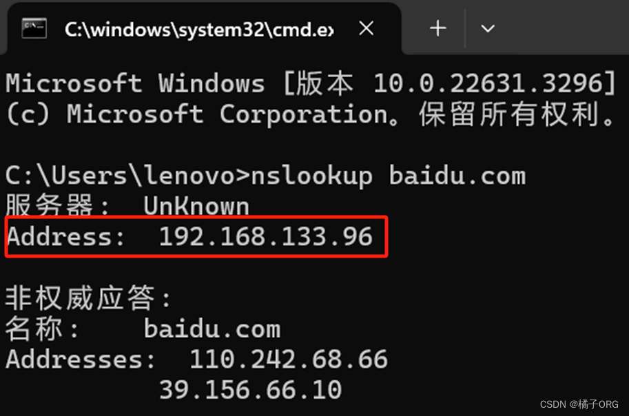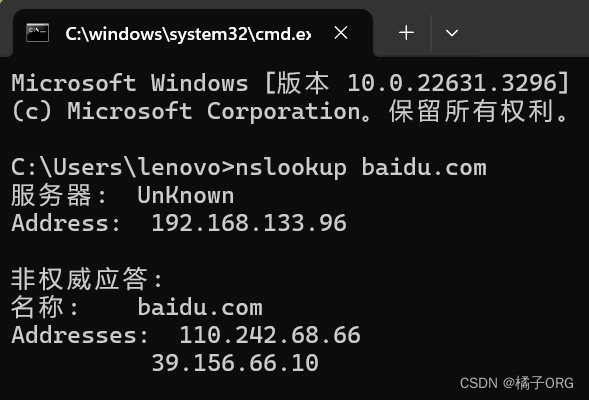 nslookup中显示的默认DNS服务器:192.168.133.96