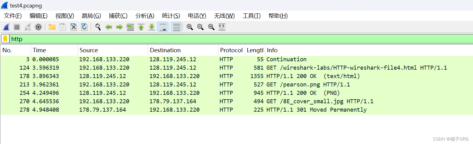 停止Wireshark数据包捕获,并在display-filter-specification窗口中输入“http”,以便只显示捕获的HTTP消息。将捕获结果保存为test4.回答下面的问题