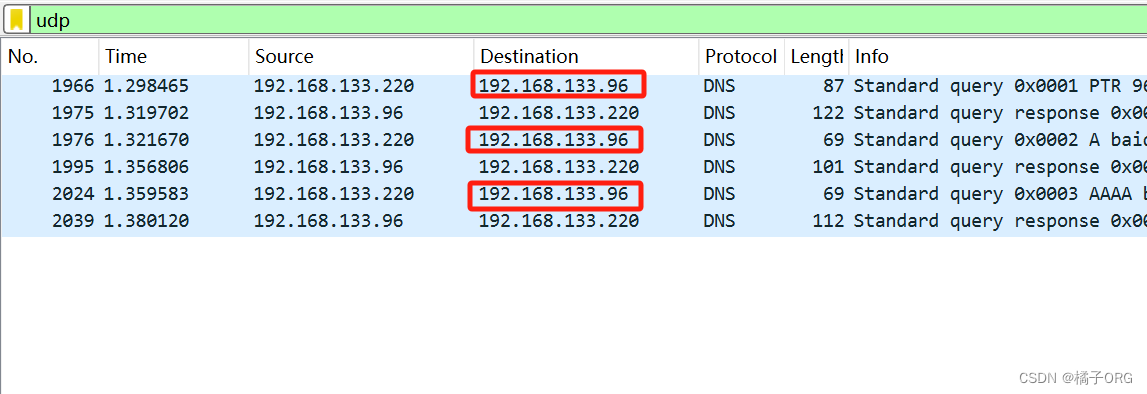 DNS请求中显示的Destination均为192.168.133.96