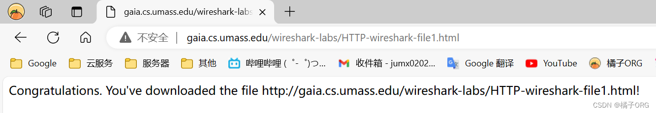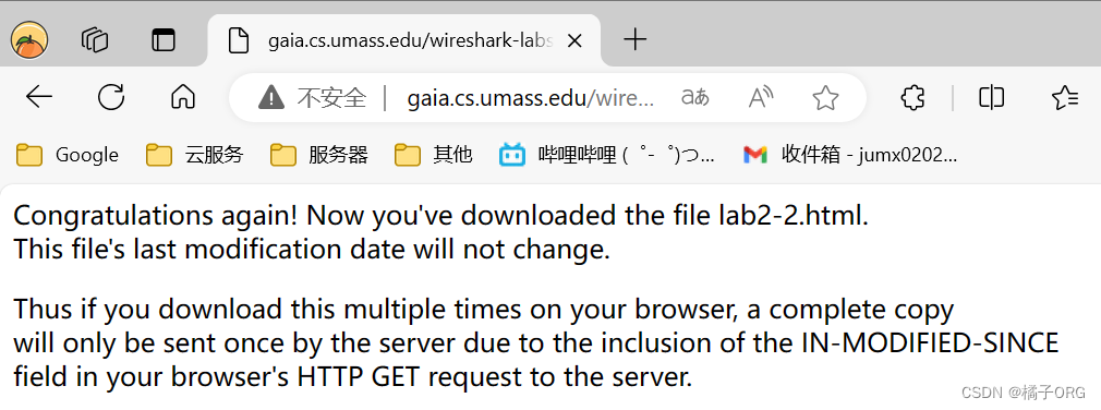(5)启动您的浏览器。启动Wireshark数据包嗅探器。在浏览器中输入以下URL http://gaia.cs.umass.edu/wireshark-labs/HTTP-wireshark-file4.html