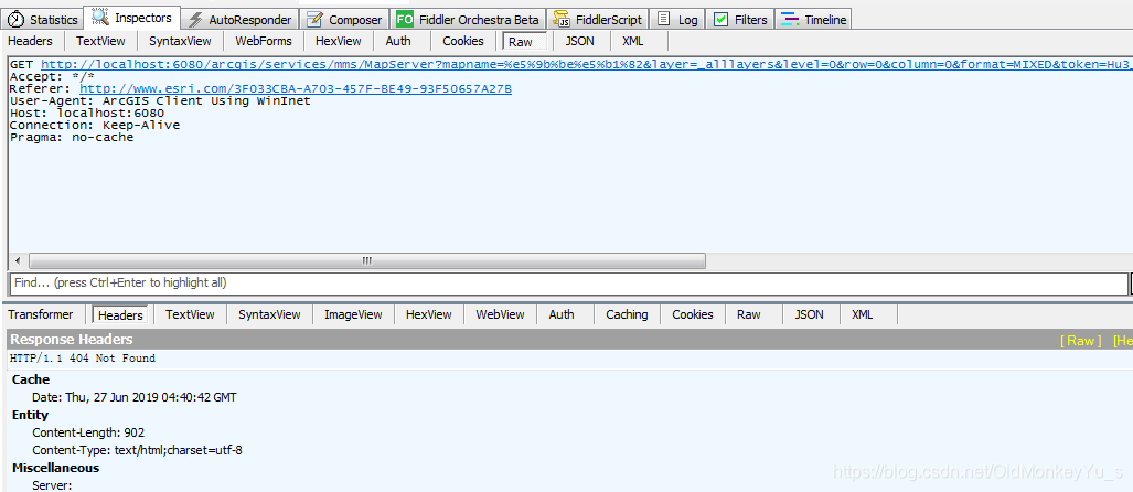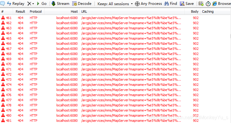 2、使用Fiddler监控请求,发现将出现bug的切片服务拖入后,出现了红色的失败请求。