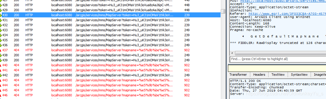 3、向上翻看http记录,发现错误记录之前,会有一些成功的记录,即ArcServer定义的GetDefaultMapName的soap服务。