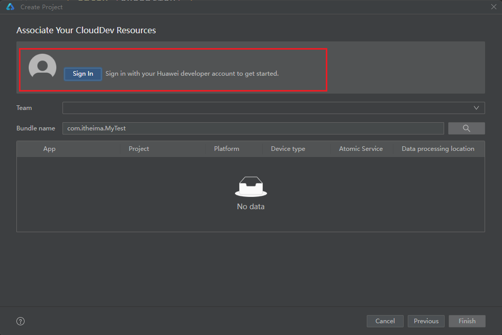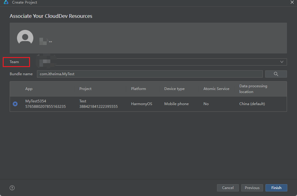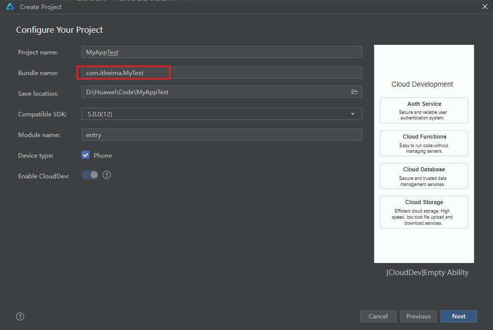 输入项目名字和包名,这里需要注意的是,包名是在AGC里面创建应用时候的包名,要不然会显示错误。而且类型也要选择和AGC里面选的一样,是应用不是元服务。