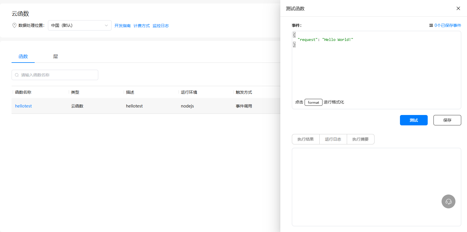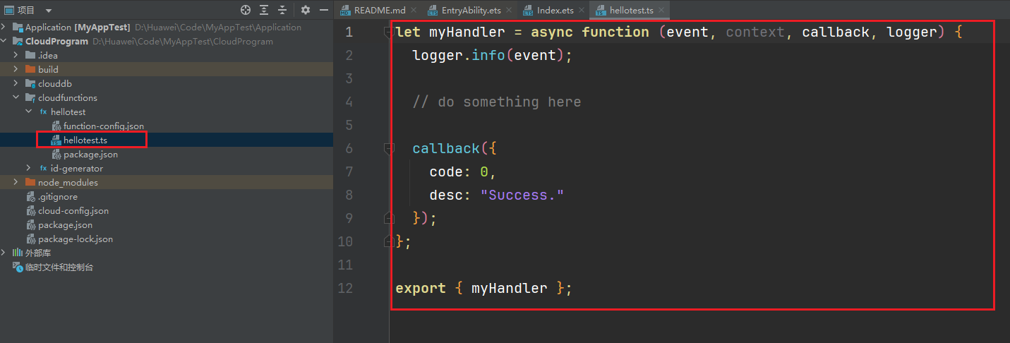 打开hellotest.ts文件,可以看到云函数只需要使用typescript语言就可以编辑。默认是云函数的入口函数,架构不能修改。