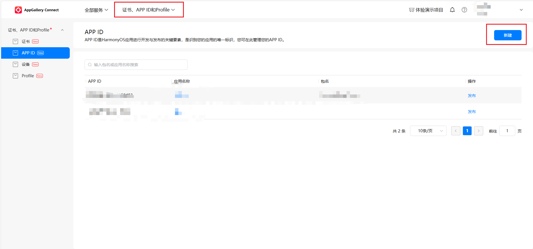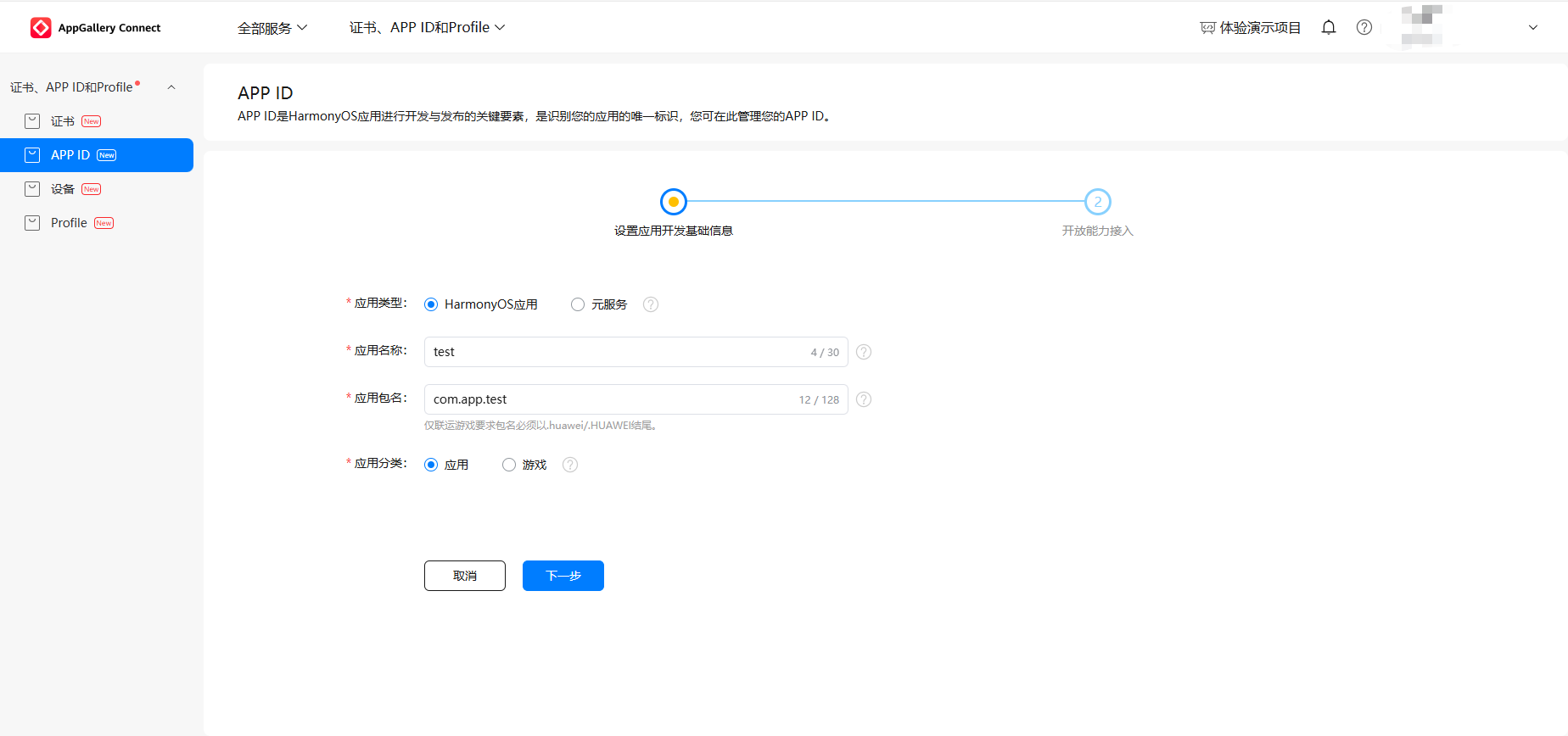 - 跳转到证书和APPID界面,去新建应用的ID。示例开发的是端云一体化项目,因此需要选择为HarmonyOS应用,并输入应用名称和包名。