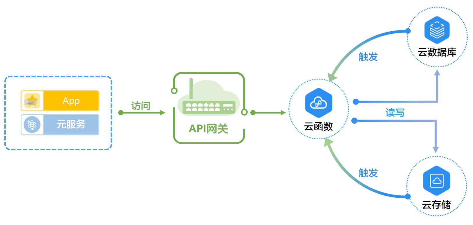 因此,在开发过程中,开发人员无需重新学习后端开发语言,可以通过对云函数的访问来读写云数据库和云存储。访问路径如下图:
