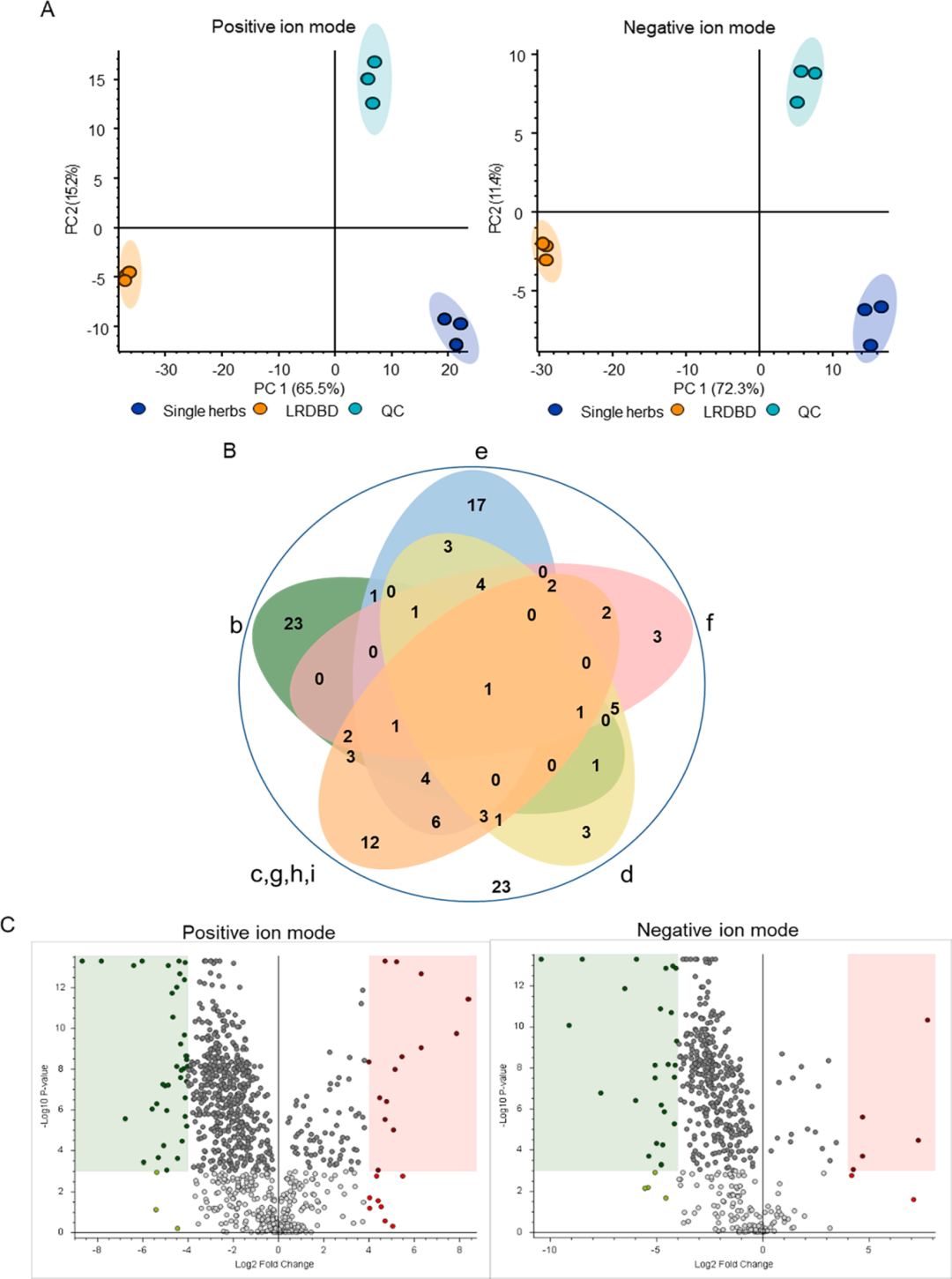 本研究通过UPLC-HRMS的研究方法,将煎煮后的LRDBD、8种单药的成分及大鼠血浆中的入血成分进行分析,在LRDBD中鉴定了122种成分,其中有23种新成分是8种单药中不存在的,LRDBD和8种单一药草之间有39个差异代谢物,在血浆中鉴定出29种原型入血成分和35种代谢产物。本研究结果为进一步发现潜在的药物靶点和揭示LRDBD在哮喘治疗中的作用机制提供了指导。