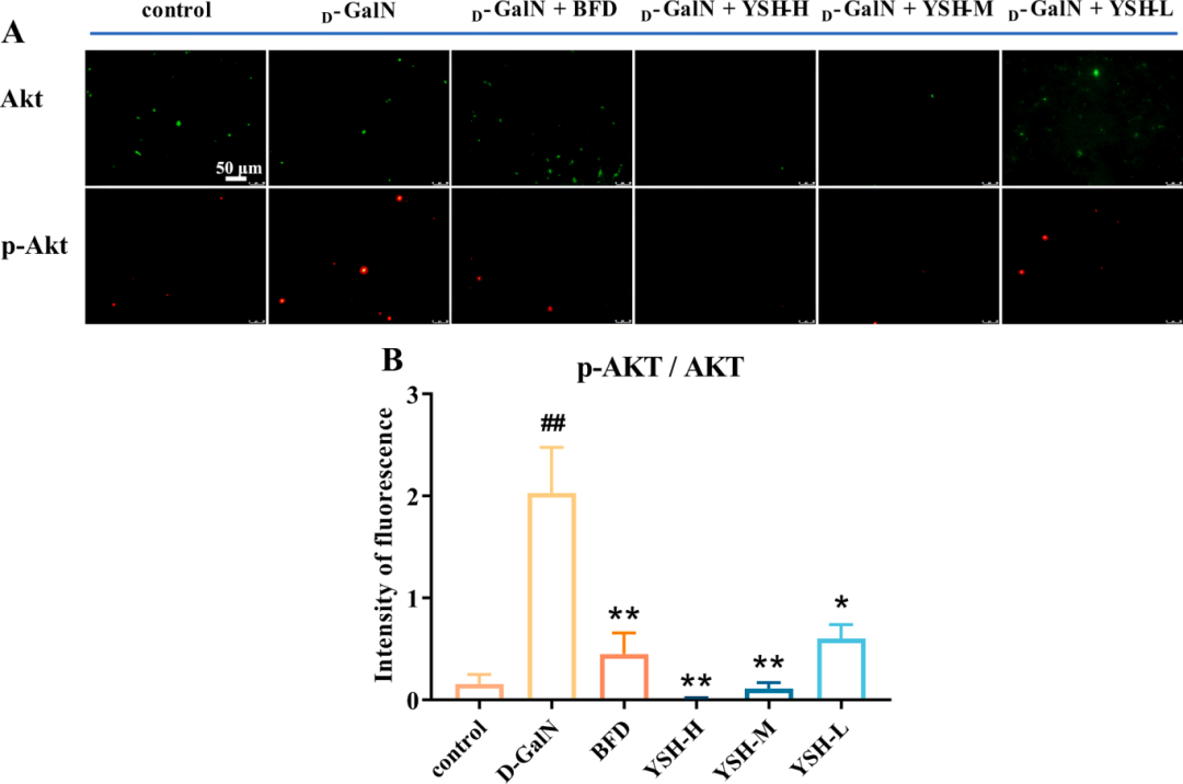 为了证实YSH对CLI的治疗作用,作者建立了CLI大鼠模型,发现YSH可改善大鼠肝功能以及组织病理学的改变。对氧化应激反应相关指标SOD、MDA和GSH-PX及促炎细胞因子TNF-α、IL-1β和IL-6的含量测定,发现YSH可减轻氧化应激和炎症反应。对肝纤维化的程度相关指标HA、PIII和Hyp测定发现YSH可减轻CLI大鼠的纤维化程度。最后免疫荧光实验表明YSH显著抑制D-GalN诱导的CLI引起的大鼠肝脏AKT磷酸化。