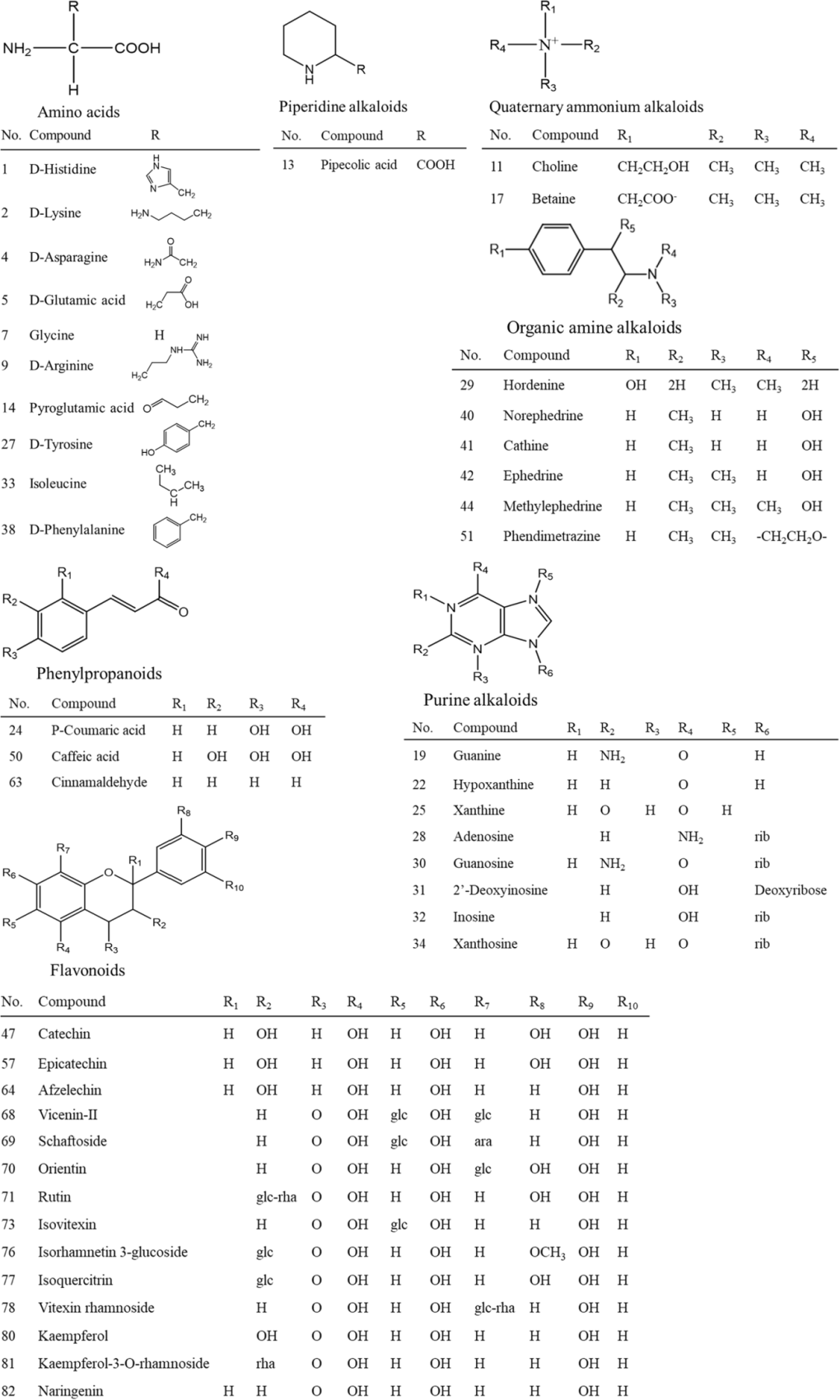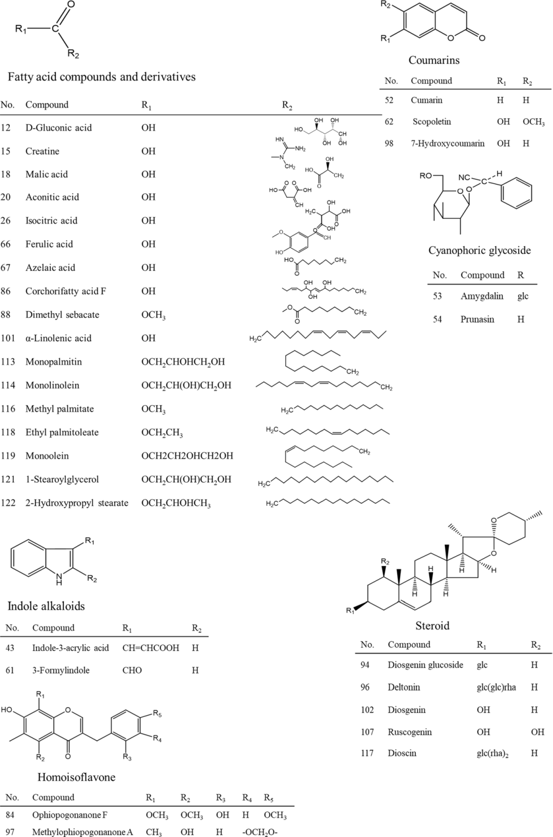 利用UHPLC–Q Exactive Orbitrap–HRMS的方法对鹿茸大补汤的成分进行分析,鉴定到了122种代谢物,主要是氨基酸、生物碱、苯丙类、氰化糖苷、黄酮、脂肪酸及其衍生物类物质。