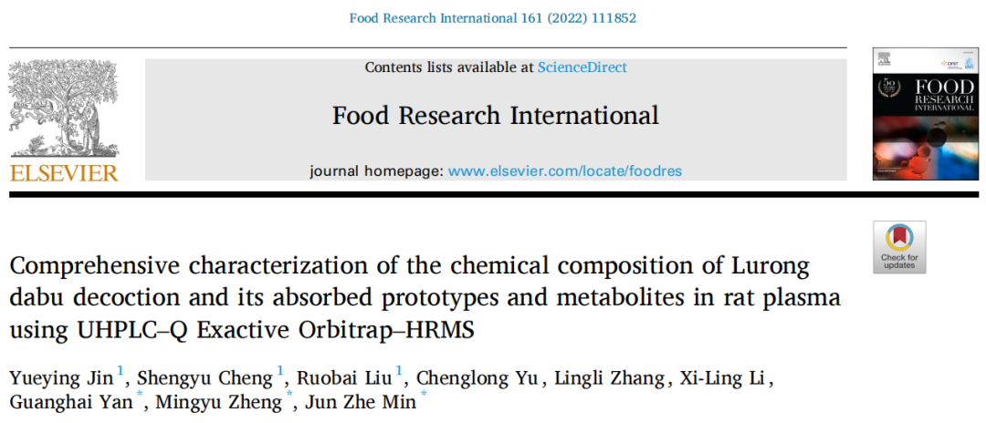 2022年8月25日,延边大学药学院闵俊哲教授团队在Food Research International(IF:7.0)上发表了题为“Comprehensive characterization of the chemical composition of Lurongdabu decoction and its absorbed prototypes and metabolites in rat plasma using UHPLC–Q Exactive Orbitrap–HRMS”的研究性论文。