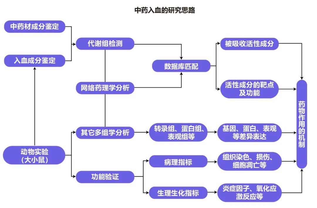 中药入血的研究思路,首先是通过代谢组学技术确定中药药材、方剂等包含多少种药用成分,然后针对不同疾病构建对应的动物模型,接下来就是通过不同的给药方式或给予同种药物的不同剂量,进行模型治疗,通过疗效观察以确定中药治疗的方案,并进一步对其进入体内的成分即入血成分进行解析,寻找药效物质。通过结合网络药理学分析以及转录组、蛋白组、表观组等多组学技术,挖掘出有效药用成分及关键调控机制。最后从病理指标和生理生化指标来验证中药药效分子机理。