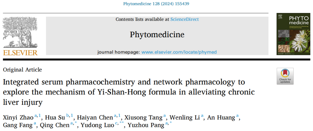 2024年2月8日,广西中医药大学壮医药学院庞宇舟教授团队在Phytomedicine(IF:6.7)上发表了题为“Integrated serum pharmacochemistry and network pharmacology to explore the mechanism of Yi-Shan-Hong formula in alleviating chronic liver injury”的研究性论文。