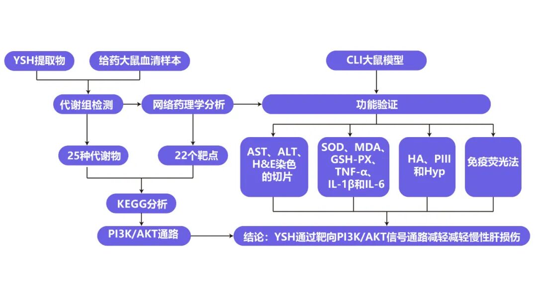 本研究结合血清药物化学和网络药理学的方法来确定了YSH治疗CLI的有效代谢物和功能机制。代谢组学分析发现YSH产生25种化合物。网络药理学及KEGG分析发现治疗CLI的潜在YSH靶点主要集中在PI3K/AKT信号通路内。进一步构建了CLI大鼠模型,验证了YSH可以通过靶向PI3K/AKT信号通路恢复CLI大鼠的肝功能,减轻氧化应激和炎症,抑制肝纤维化。