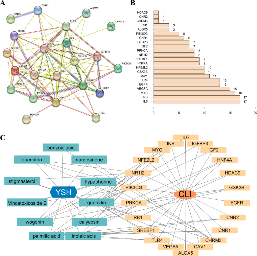 利用TCMSP和ETCM数据库对与25种物质相关的靶基因进行鉴定,结果发现了277个靶基因。并且联合GeneCards和OMIM数据库进行搜索,发现与CLI相关的基因有397个。进一步利用Cytoscape v3.10.0软件构建化合物靶标网络,发现22个靶点可能与YSH的治疗效果有重要关系。最后,通过KEGG通路富集分析,发现这些靶点主要集中在PI3K/AKT信号通路上。