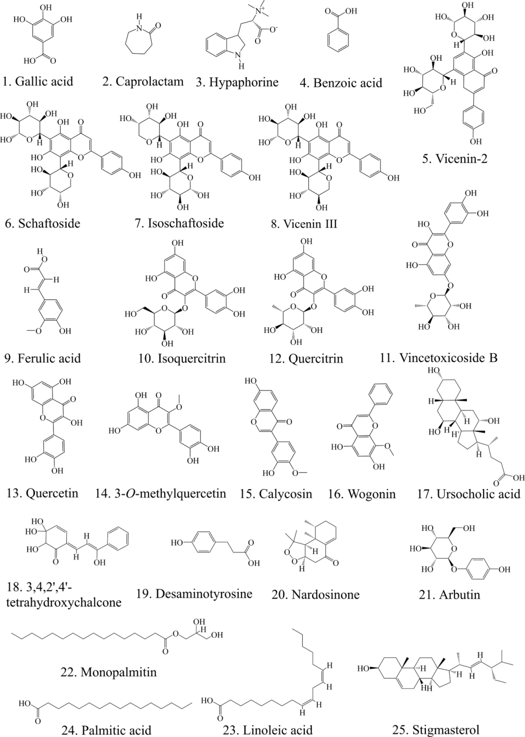 首先,作者采用UPLC-Q-TOF-MS方法对大鼠血清样本中可吸收的YSH代谢物进行鉴定,结果鉴定出了25种化合物,包括没食子酸、己内酰胺、黄碱、苯甲酸、维采宁2、夏佛塔苷、异夏佛塔苷、维采宁3、阿魏酸、异槲皮苷、白前苷B、槲皮苷、槲皮素、3-O-甲基槲皮素、毛蕊异黄酮、汉黄芩素、熊果胆酸、紫铆因、脱氨基酪氨酸、甘松酮、熊果苷、单棕榈酸甘油、亚油酸、棕榈酸和豆甾醇等。25种化合物中已有9种被其他研究人员在毛鸡骨草中发现。