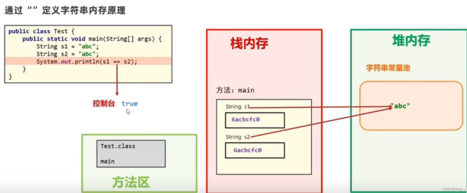 - 以" "方式给出的字符串对象,在字符串常量池中存储,而且相同内容只会在其中存储一份。