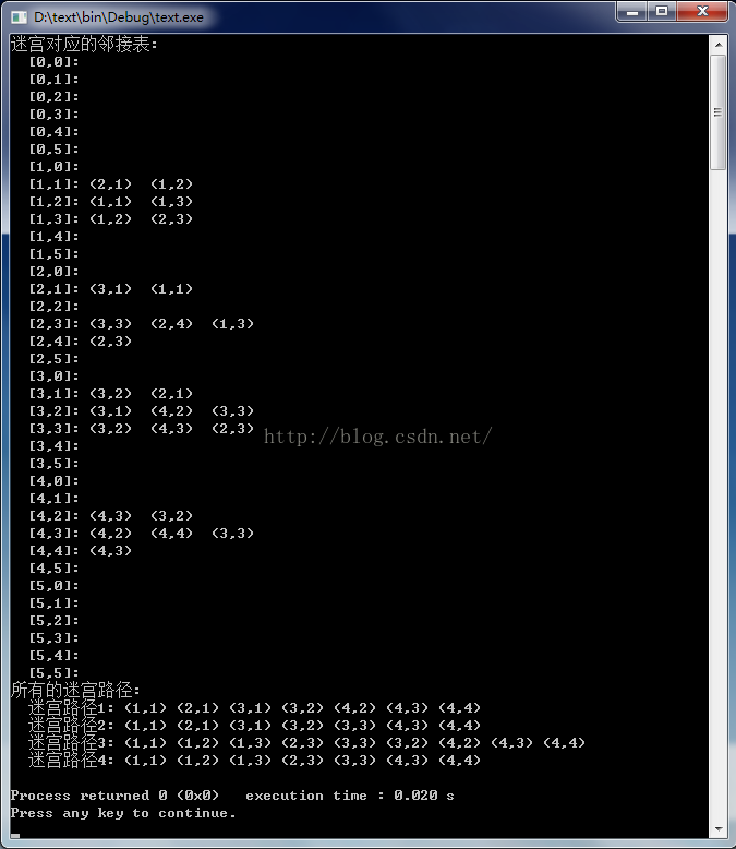 - printf("迷宫对应的邻接表:\n");