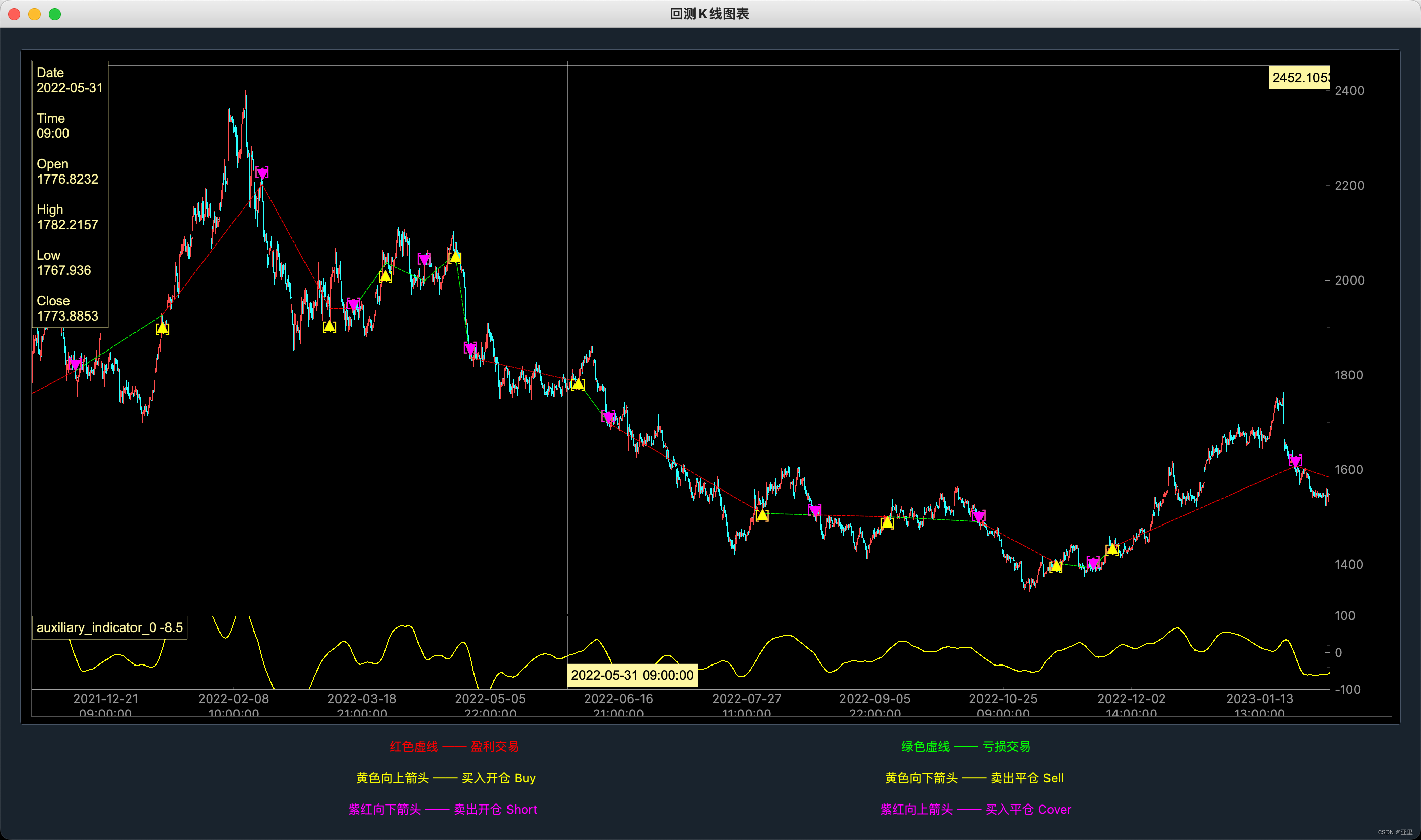 RUMI策略小试 veighna官方分享RUMI策略的公众号中,这个策略的表现相当不错。自己实现一版,回测结果也挺符合预期,获利交易笔数>亏损交易笔数,盈利交易日>亏损交易日,并且从回测的成交图上看,RUMI策略对趋势的把握也非常好,非常有潜力。