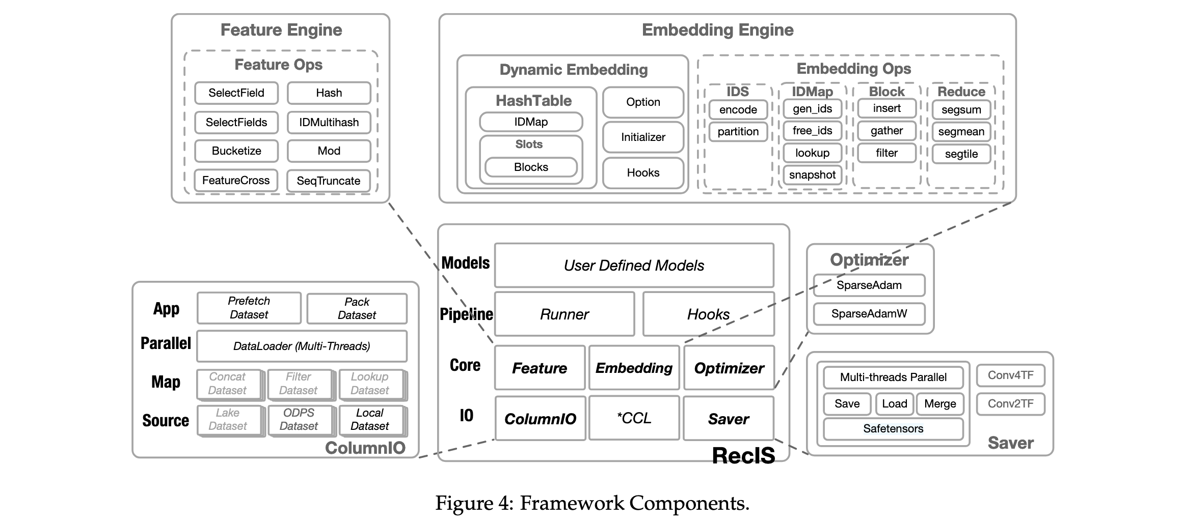 - 生产就绪的PyTorch统一稀疏-密集训练框架:提出RecIS框架,支持大规模稀疏训练,同时与现代大模型生态系统无缝集成。与TorchRec相比,该框架强调工业就绪性,支持无冲突嵌入、高效IO和稀疏处理