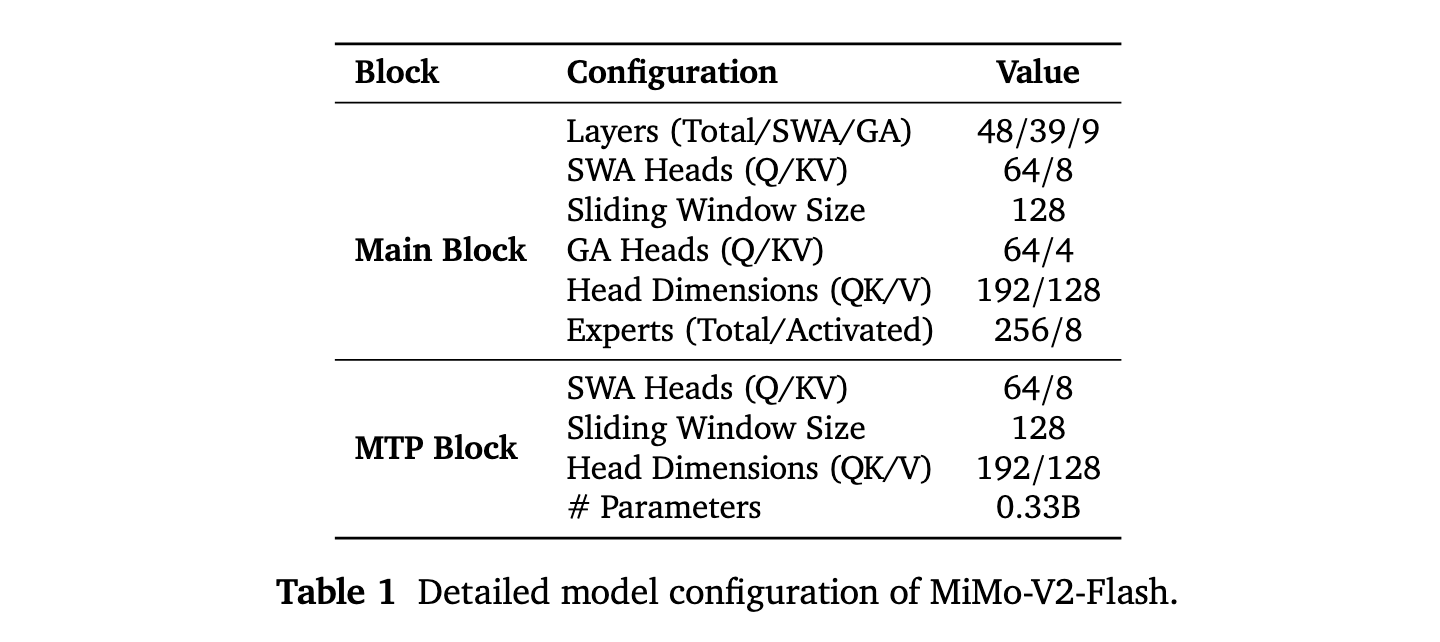 架构配置: 模型共48层(39层SWA + 9层GA),采用Grouped-Query Attention (GQA)。SWA层使用64个query头和8个KV头,GA层使用64个query头和4个KV头。每个头的维度为192(QK)和128(V)。RoPE位置编码部分应用于前64维。除第一层外,所有层使用sparse MoE FFN,每个MoE层包含256个专家,每token激活8个,无共享专家。总参数309B,激活参数15B。