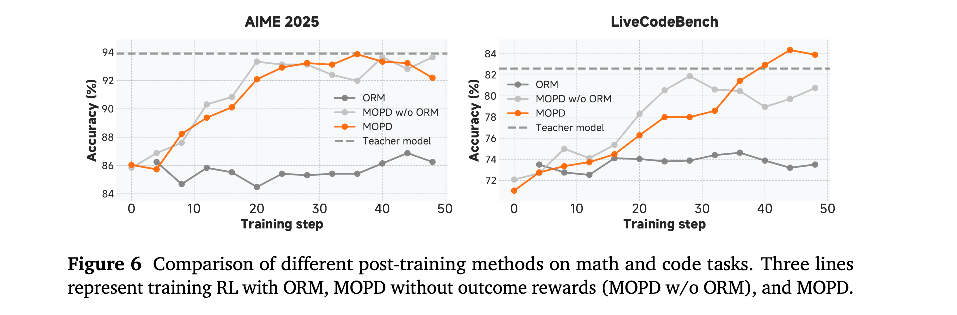 - MOPD的能力保持: 学生模型在所有领域达到或超越最强教师性能,无"跷跷板效应"。数学和代码任务上,MOPD持续优于纯ORM训练