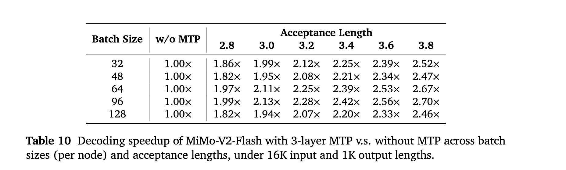 - 轻量级MTP加速推理与RL: 设计轻量级Multi-Token Prediction模块(每层仅0.33B参数),采用dense FFN和滑动窗口注意力,实现高达3.6的平均接受长度和2.6倍解码加速。特别适用于RL训练的rollout加速,解决小batch on-policy训练的GPU利用率问题