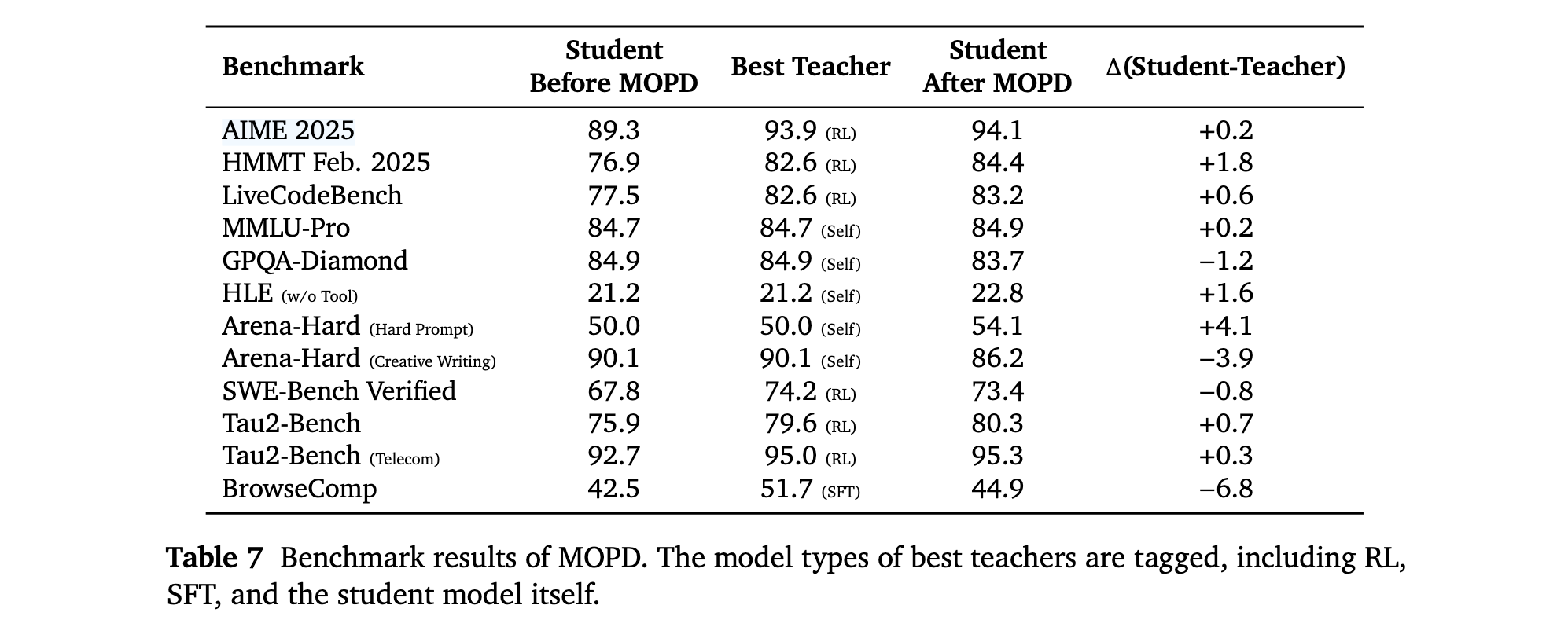 优势: MOPD实现了学生模型在所有领域匹配或超越最强教师的性能(表7)。例如,在AIME 2025上从89.3%提升至94.1%(教师93.9%),在HLE上从21.2%提升至22.8%(教师自身)。相比传统参数合并或离线蒸馏,MOPD避免了分布不匹配,提供密集token级信号,学习高效且稳定。