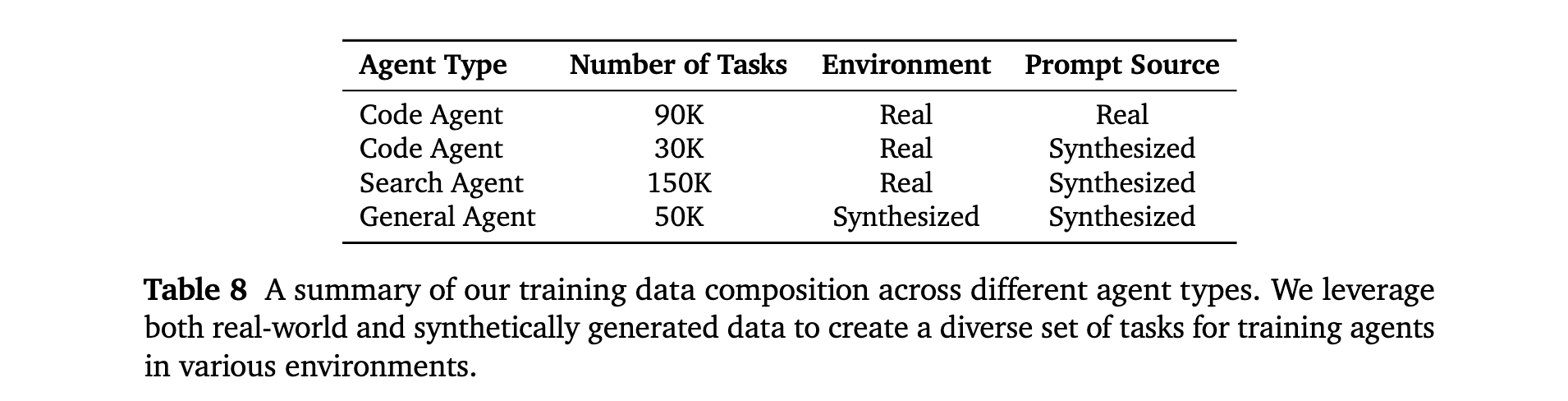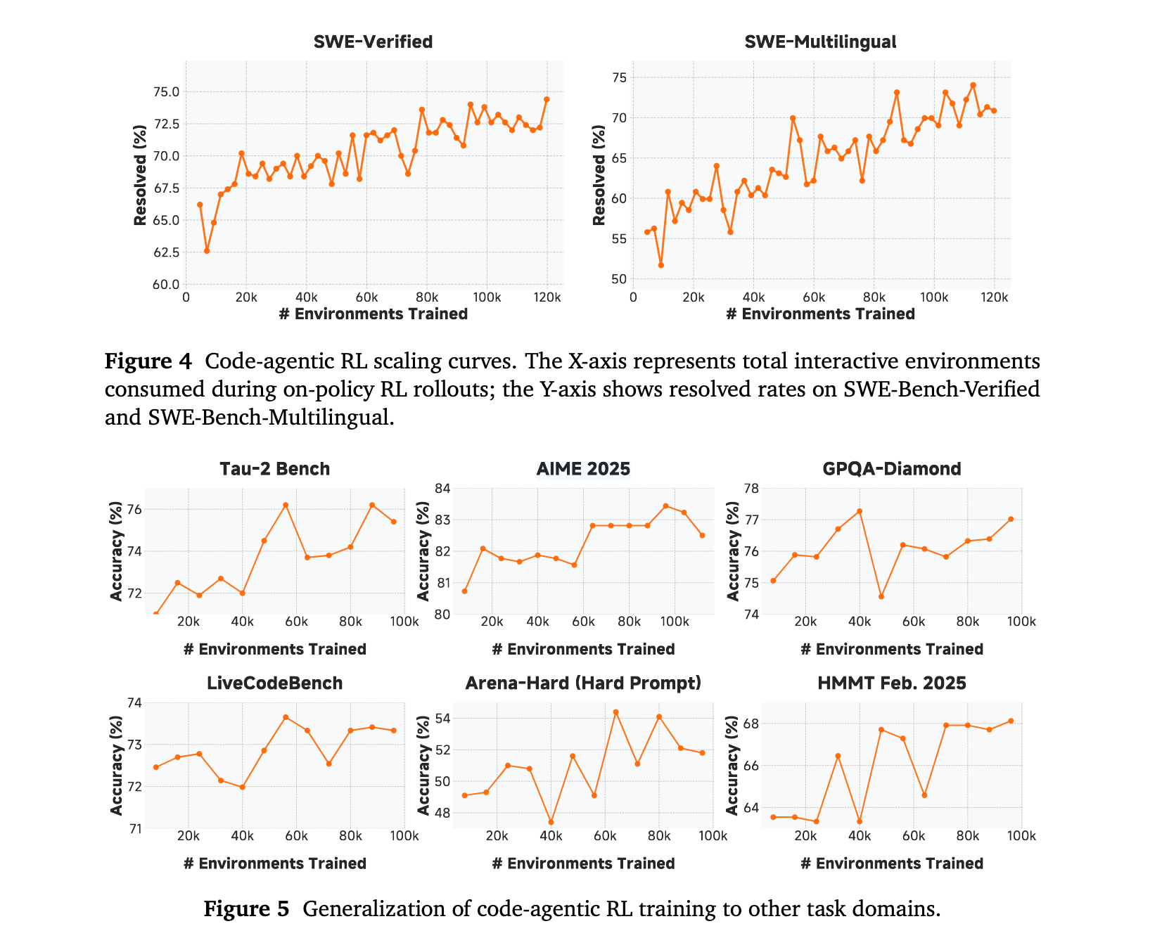 - 代码Agent RL的泛化性: 大规模代码Agent RL训练(12万环境)不仅提升代码任务,还泛化到数学、通用推理等领域,表明Agent训练发展了广泛可迁移的问题解决能力