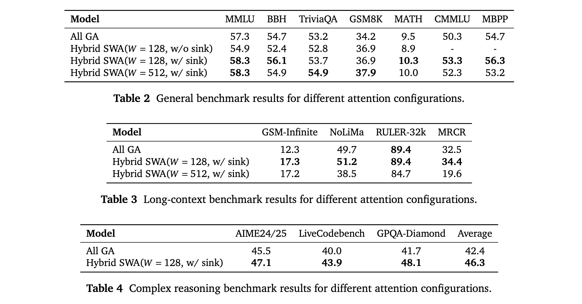 其中 m i = max ( max j a i j , sink ) m_i = \max(\max_j a_{ij}, \text{sink}) mi=max(maxjaij,sink)。这使得模型可以在不需要关注任何token时,将注意力分配给"sink",显著增强了SWA架构的建模容量。消融实验显示,无attention sink的128-window SWA在MMLU等基准上性能下降2-3个百分点,而加入sink后性能反超全局注意力基线。